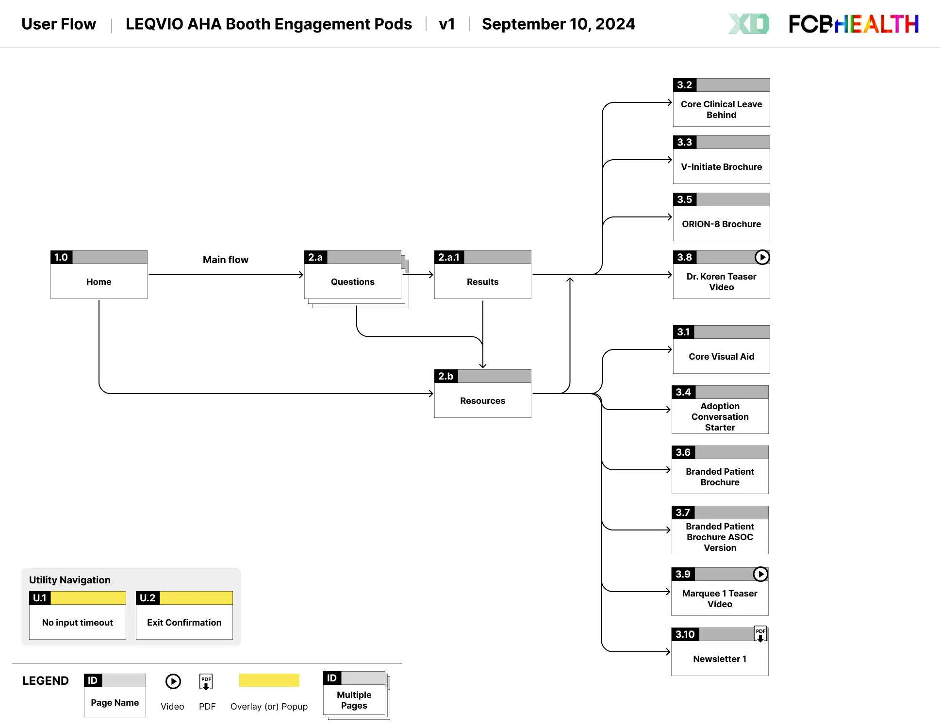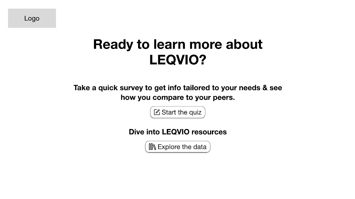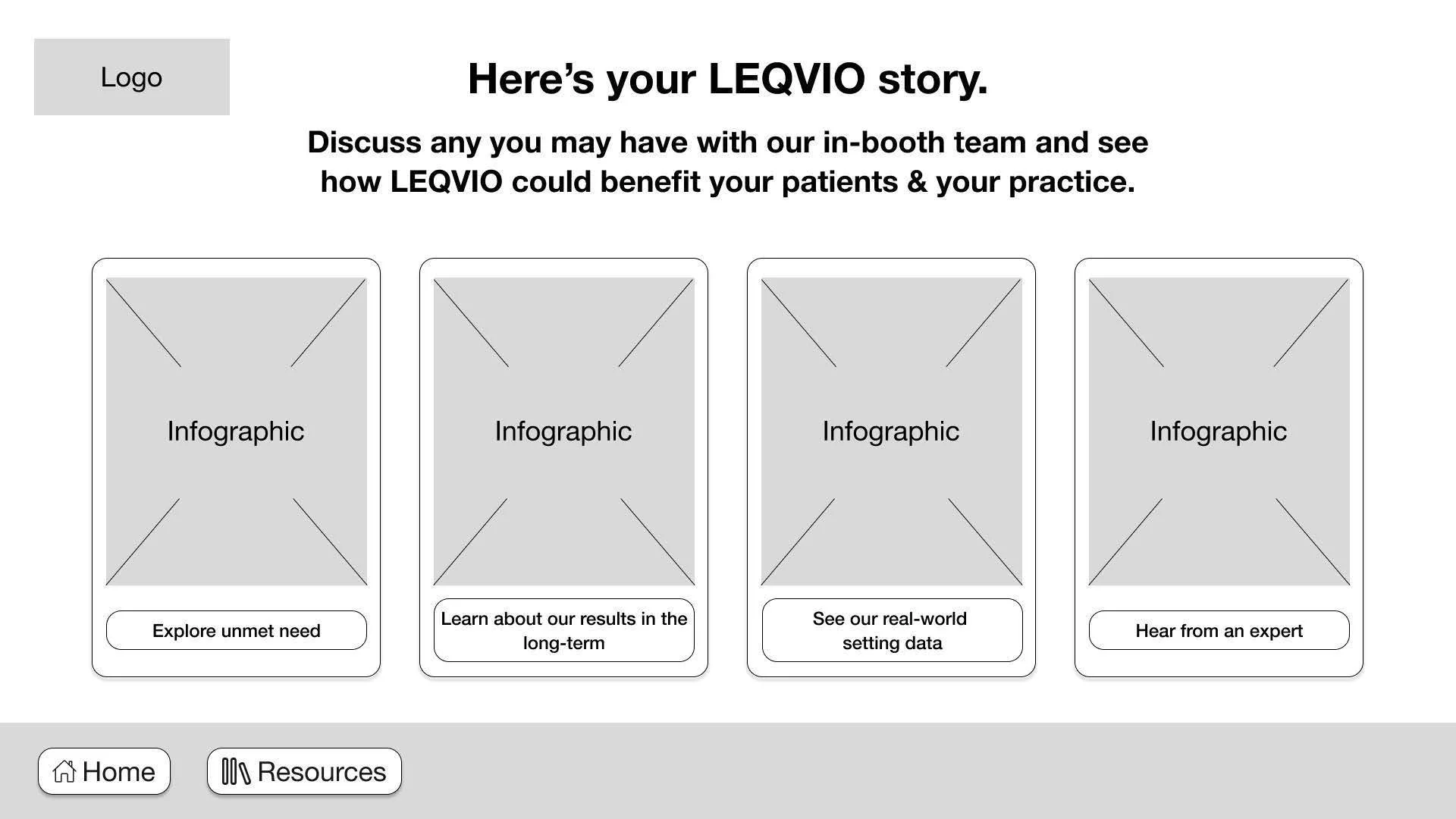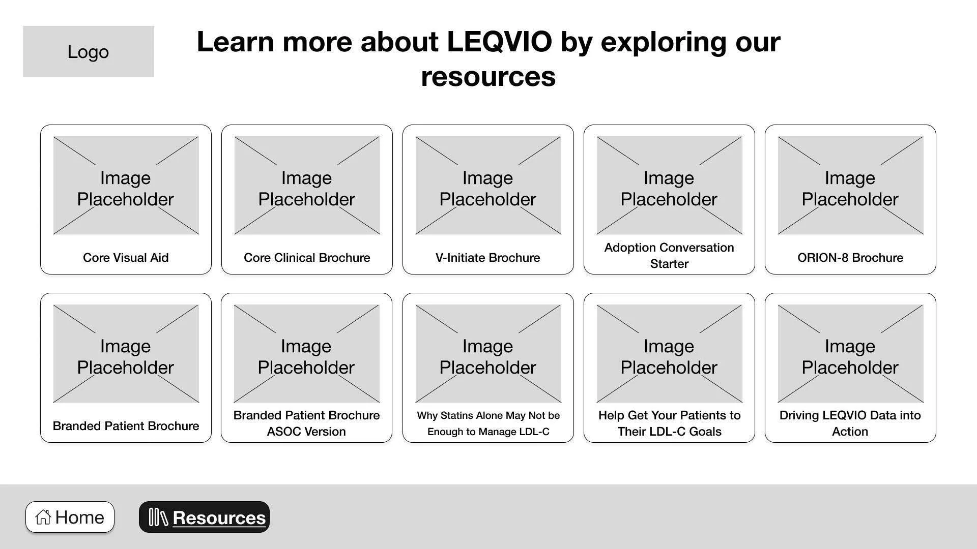 In addition to our initial idea of a brief quiz for HCP, the client requested to add a resource library that houses study insights, interactive visual aids, patient brochures, and videos. This last minute request created friction within the internal team because it added more choices for users and convoluted our original user flow. The client settled on making this resource library a secondary objective, one that should be accessed with a rep on standby.