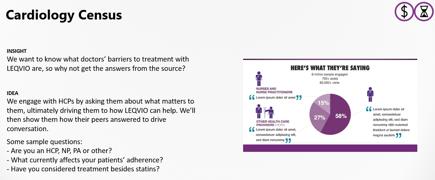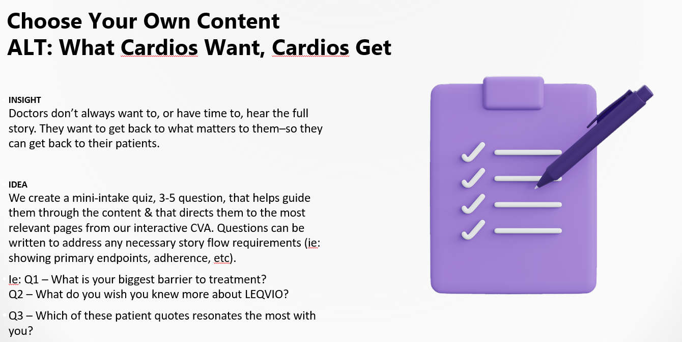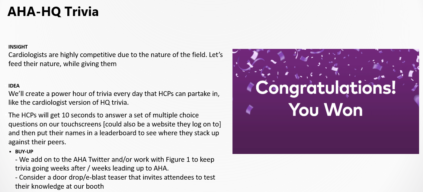 Based on this problem statement and the technical capabilities of the booth vendors, the Cardiology Census was selected as the preferred solution. This interactive experience will engage HCPs with a brief quiz and provide personalized insights by comparing their responses with those of their peers.