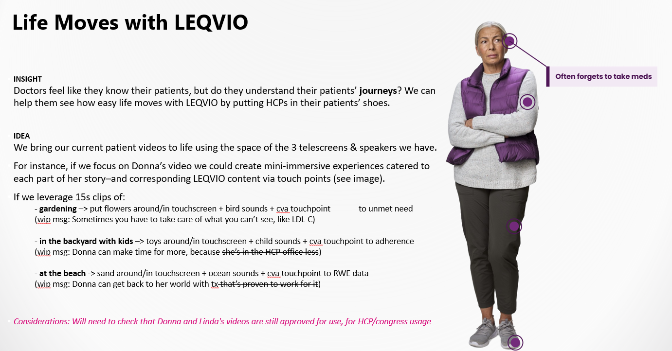 LEQVIO participated in the American Heart Association (AHA) Congress 2024 and we were tasked with designing an interactive booth experience for their 50’x50’ commercial booth to promote their prescription medication for adults with high cholesterol. The booth featured hanging signs, focal walls, pillars, and engagement pods. My team was responsible for developing a digital experience within the engagement pods to educate healthcare professionals on LEQVIO’s clinical significance in improving cholesterol through promoting medication adherence.