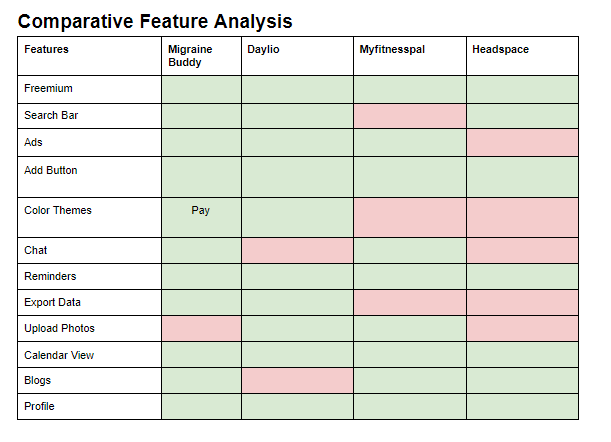 In order to understand the habit tracking market better, we did significant research on Migraine Buddy’s competitors and other industry leaders in habit tracking. We put together a competitive feature analysis of Migraine Buddy’s direct competitors (HeadApp, N1-Headache, and Migraine Insight Tracker) and a comparative feature analysis of similar companies that are not directly competing against Migraine Buddy (Daylio, Myfitnesspal, and Headspace).