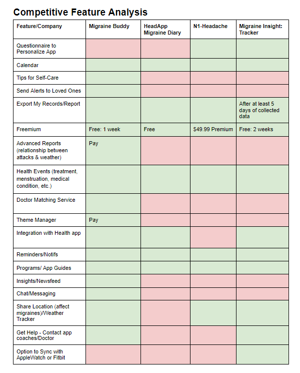 Through our feature inventory analysis, we can see why Migraine Buddy is the #1 rated app in its niche market because it has the majority of the features its competitors do not.